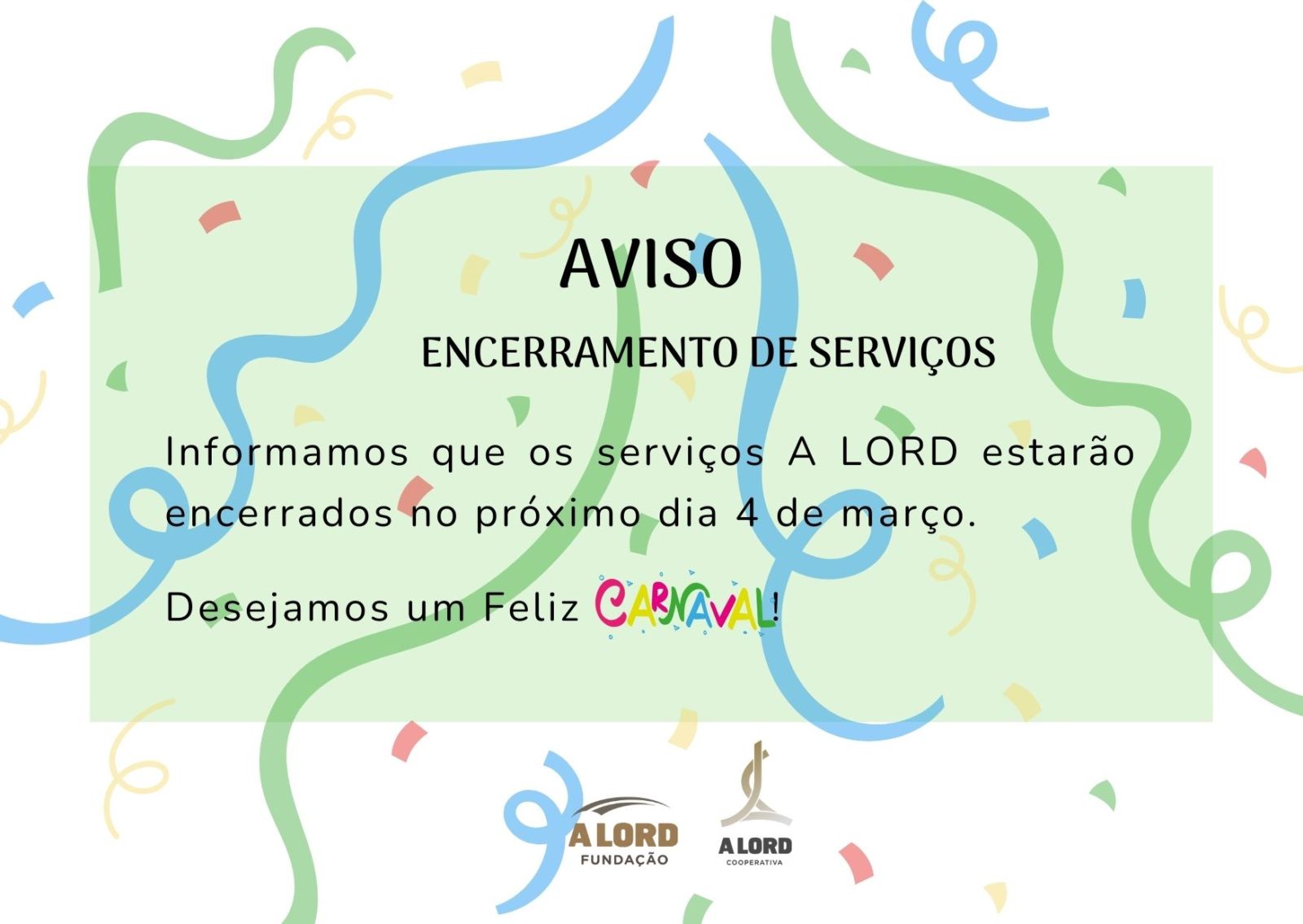 Aviso | ENCERRAMENTO DE SERVIÇOS | Carnaval